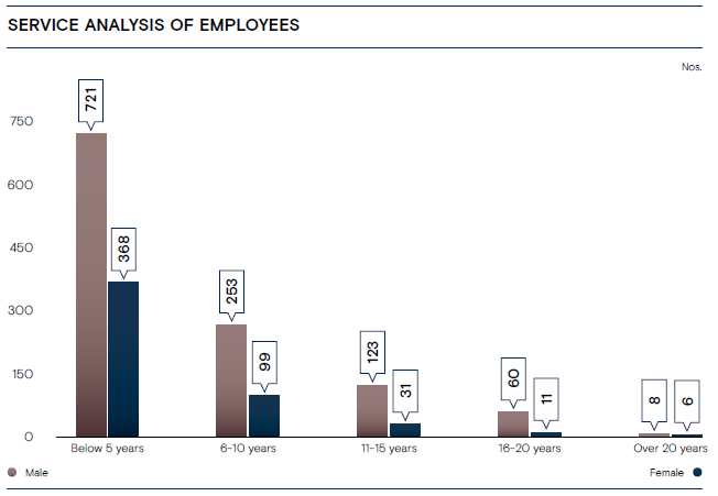 CDB team members play a pivotal role in realising the Company’s vision, implementing strategy, and driving transformation. As of 31 March 2023, CDB’s workforce comprised 1,680 individuals, with 54% being permanent employees and 46% on a contract or probationary status. Among the workforce 31% were female team members, reflecting the Company’s commitment to gender diversity. Throughout the year, CDB successfully recruited 442 new team members, while maintaining an employee retention rate of 60%, highlighting the effectiveness of our HR policies and the value proposition offered to its employees. It is noteworthy that over 14% of the workforce has been with the organisation for over 11 years, a testament to the trust and loyalty they have placed in the Company.